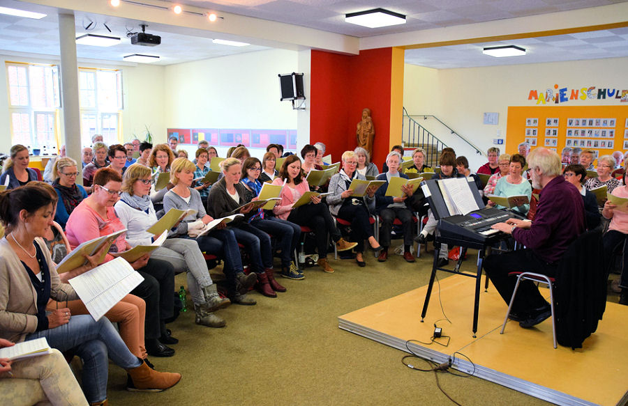 Deshalb lud Chorleiter Gerd Kerkemeier am Sonntagnachmittag beide Chöre zur ersten gemeinsamen Probe in die Aula der Marien-Grundschule. „Die Chöre müssen natürlich wissen, was der andere zu singen hat“, erläuterte der Chorleiter; dies nicht nur auf dem Notenzettel, sondern erstmals in natura.